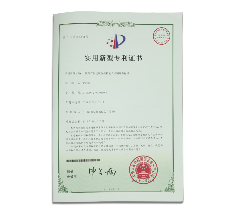 騰卓機械專利生產證書,專業制造包裝設備的生產廠家,全自動及半自動的洗瓶機,烘干機,灌裝機,旋蓋機,貼標機,套標機,打碼機等非標定制自動化包裝生產線
