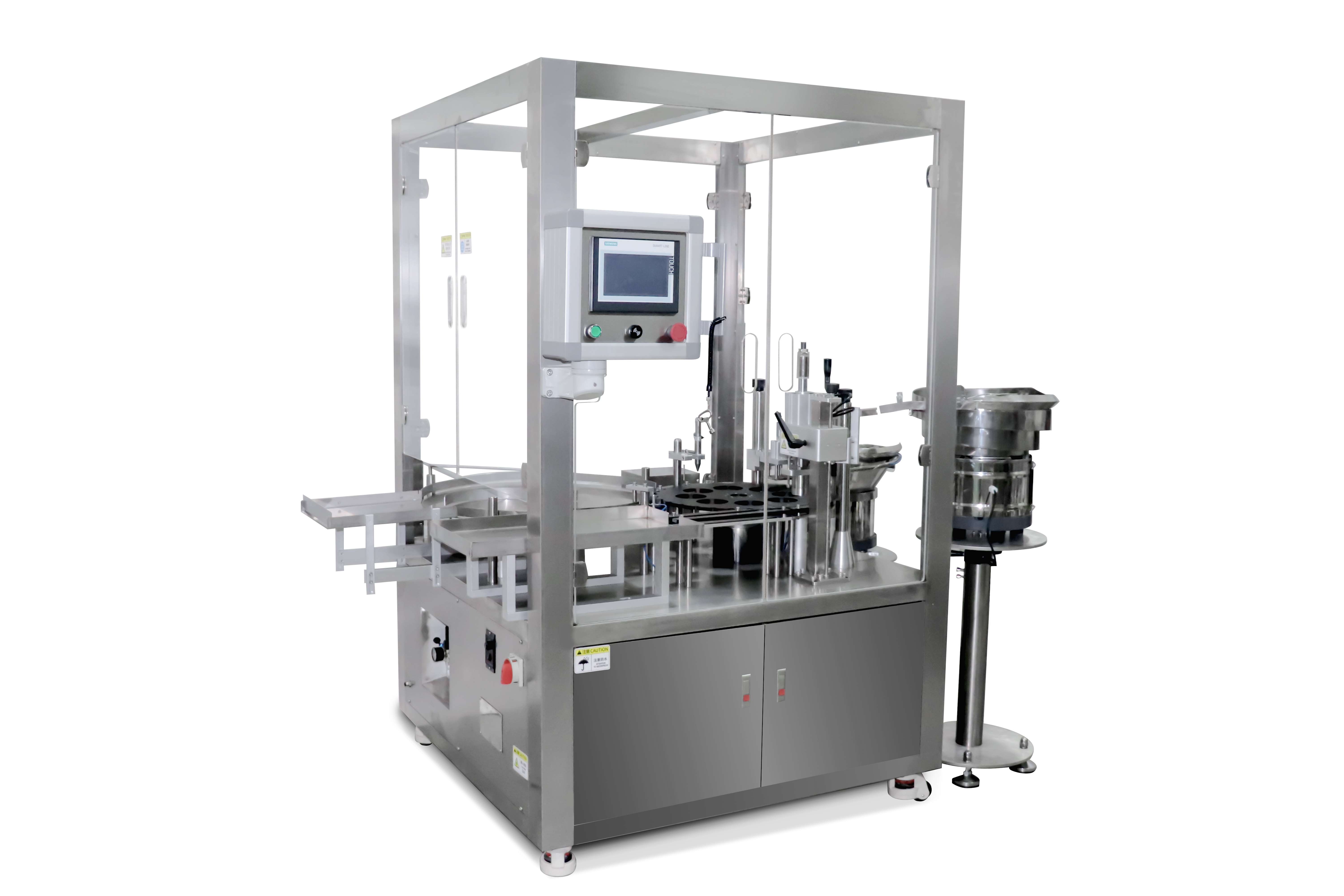 自動灌裝軋蓋機一體機可用于西林瓶、精油瓶、香水瓶全自動灌裝旋蓋及鎖蓋設備。整套流程分為:理瓶-灌裝-壓塞-掛蓋-軋蓋,其特點為生產穩定,對包材通用性強。